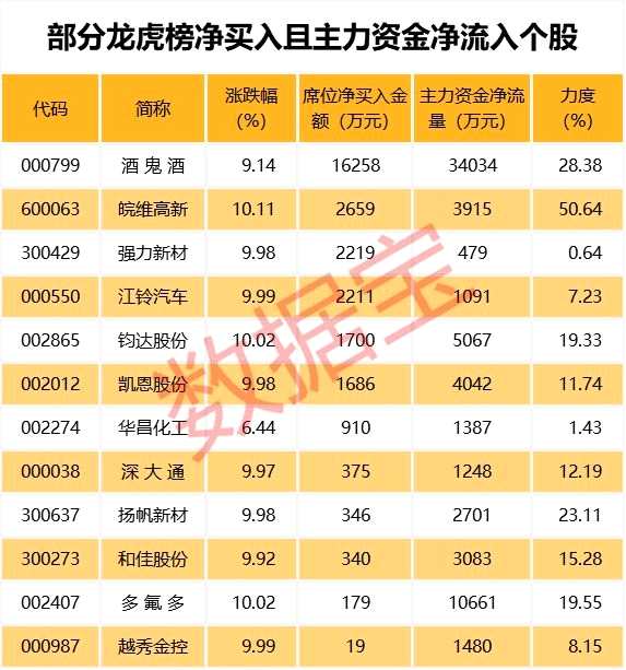 從盤口資金流向來看,主力資金凈流入超千萬且龍虎榜凈買入個股共有11只,其中酒鬼酒、多氟多、鈞達股份等個股資金凈流入金額最大。凈流入力度最大的個股有皖維高新、酒鬼酒、揚帆新材,凈流入力度分別為50.64%、28.38%、23.11%。