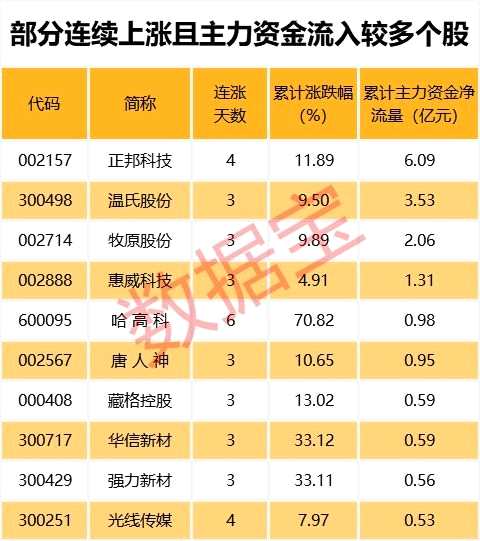 值得注意的是,60只連續(xù)上漲個股中,4只個股期間主力資金累計凈流入超過億元。其中,累計資金流入最多的為正邦科技,主力資金累計流入6.09億元。