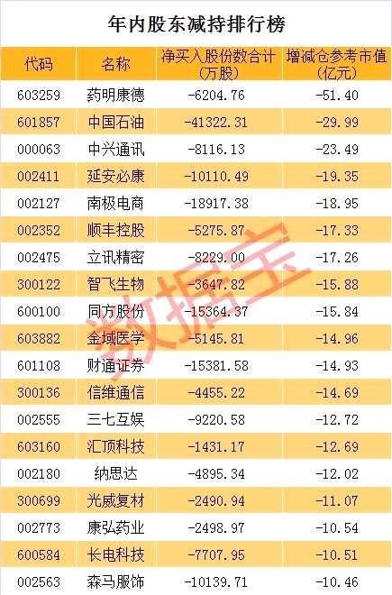 中國石油位居年內(nèi)重要股東凈減持金額榜單第二位,減持金額接近30億元。中興通訊位居第三位,股東凈減持金額超過23億元。延安必康、南極電商、順豐控股等16股被股東凈減持均超過10億元,申通快遞、美年健康、佳都科技等21股被股東凈減持均超過5億元。