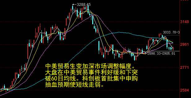 短期來(lái)看,大盤(pán)持續(xù)窄幅震蕩后在中美貿(mào)易階段性緩和利好下突破60日均線。量能不足以及科創(chuàng)板首批集中申購(gòu)抽血預(yù)期使市場(chǎng)短線走弱。