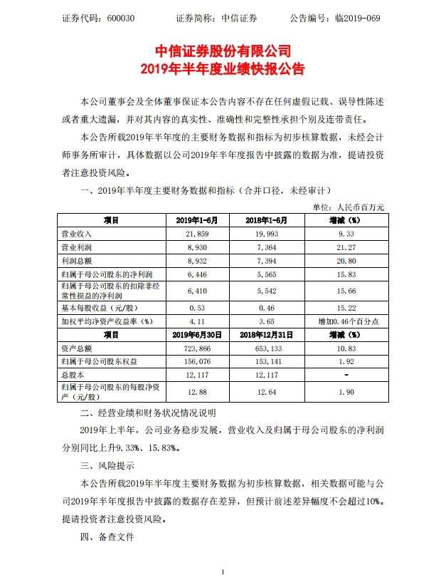 中信證券(600030)7月12日晚間披露業(yè)績(jī)快報(bào),公司2019年上半年實(shí)現(xiàn)營業(yè)收入218.59億元,同比增長(zhǎng)9.33%;凈利潤(rùn)64.46億元,同比增長(zhǎng)15.83%。