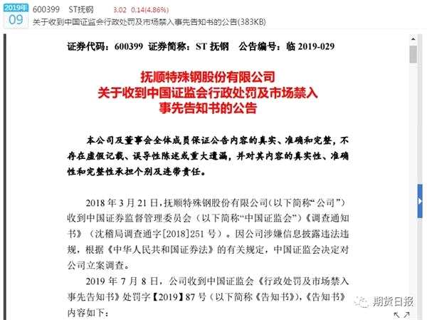 根據(jù)7月8日晚間公布的公告,ST撫鋼稱公司已于當(dāng)日收到中國(guó)證監(jiān)會(huì)《行政處罰及市場(chǎng)禁入事先告知書》處罰字【2019】87號(hào)(以下簡(jiǎn)稱《告知書》)?!陡嬷獣凤@示,撫順特鋼(600399,股吧)自2010年至2017年持續(xù)8年財(cái)務(wù)造假,證監(jiān)會(huì)擬對(duì)公司罰款60萬(wàn)元,對(duì)其他45名責(zé)任人擬處以5萬(wàn)元—30萬(wàn)元不等的罰款,合計(jì)罰款575萬(wàn)元,7名責(zé)任人被市場(chǎng)禁入。而在此之前,ST撫鋼因未在法定期限內(nèi)披露2017年年報(bào)及2018年第一季度報(bào)告,已于2018年3月21日被證監(jiān)會(huì)立案調(diào)查。