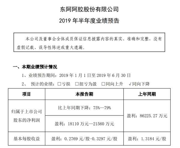 7月14日,傍晚時分,先是百威亞太終于確定終止H股上市計劃,接著,二級市場上的明星級公司、有著“藥中茅臺”之稱的【東阿阿膠(000423)、股吧】半年度業(yè)績讓人大跌眼鏡。東阿阿膠(000423)披露業(yè)績預(yù)告,預(yù)計公司2019年半年度凈利潤為1.81億元至2.16億元,同比下滑75%-79%。所料不錯的話,這應(yīng)該是今年中報業(yè)績預(yù)告以來,第一家明星級上市公司爆出業(yè)績大雷。