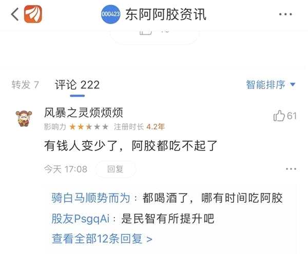 有投資者表示,有錢人變少了,阿膠都吃不起了。還有人認(rèn)為,都喝酒去了,哪有時間吃阿膠。