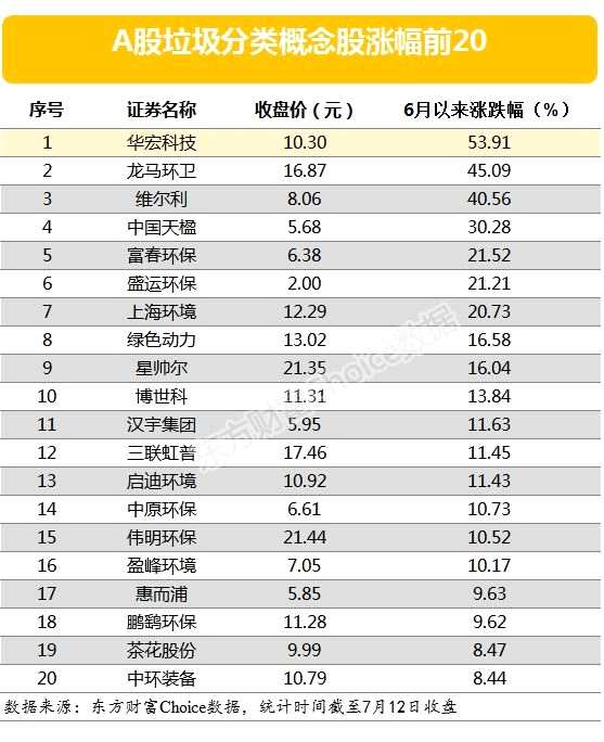 據(jù)數(shù)據(jù)顯示,自6月以來,A股市場上的55只垃圾分類概念股中,有36只個股上漲,占比65%。其中,華宏科技的漲幅最大,達到54%。另外,龍馬環(huán)衛(wèi)和維爾利以及【中國天楹(000035)、股吧】的股票表現(xiàn)也很亮眼,同期漲幅均超過了20%。