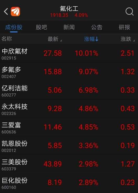 7月12日,氟化工概念表現(xiàn)搶眼,中欣氟材盤中直線拉漲停,多氟多、【億利潔能(600277)、股吧】、永太科技、三愛富、凱恩股份等氟化工概念股紛紛上漲。概念大漲的背后,究竟是什么原因?