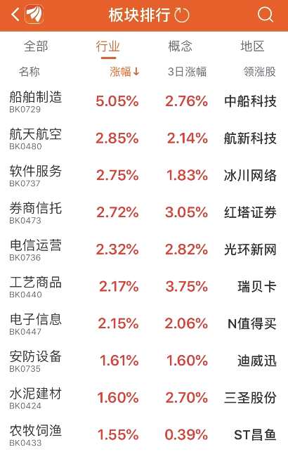 其中收盤船舶制造、航天航空漲幅靠前;券商與軟件板塊上午強勢領(lǐng)漲。