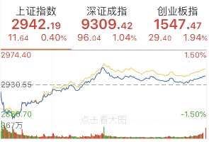 其中滬指小幅收漲0.4%,收報2942.19點;深成指收漲1.04%,收報9309.42點;創(chuàng)業(yè)板指走勢較強,收漲1.94%,收報1547.47點。