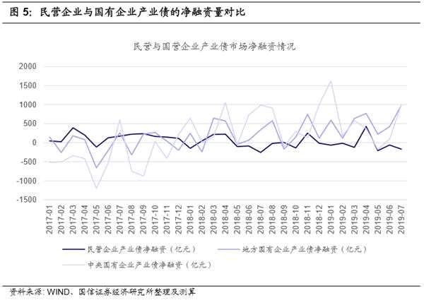 7月國有企業(yè)產(chǎn)業(yè)債凈融資大幅提升,民營企業(yè)產(chǎn)業(yè)債凈融資卻繼續(xù)回落,已連續(xù)三個(gè)月處于負(fù)值區(qū)間,民營企業(yè)在債券市場的融資仍維持弱勢(shì)局面。