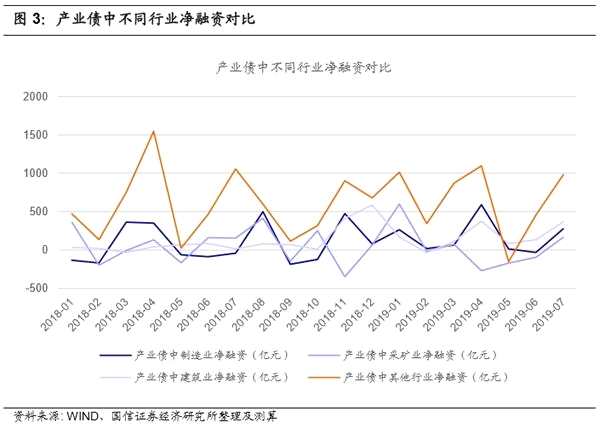 7月產(chǎn)業(yè)債凈融資較6月大幅提升,其中制造業(yè)、采礦業(yè)、建筑業(yè)、其他行業(yè)均明顯回升。從不同公司屬性來看,7月地方國有企業(yè)和中央國有企業(yè)凈融資明顯提升,民營企業(yè)產(chǎn)業(yè)債凈融資量卻繼續(xù)回落,仍處于負(fù)值區(qū)間。