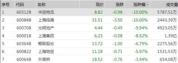 自貿(mào)港概念領(lǐng)跌兩市,板塊指數(shù)大跌逾2%,華貿(mào)物流、上海臨港等跌停,上港集團(tuán)大跌逾8%,寧波港、外高橋、錦江投資等跌幅居前。