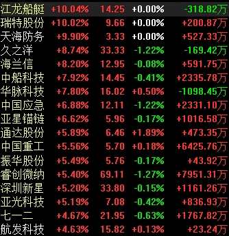 周四早盤(pán), 軍工股集體拉漲,截至發(fā)稿,江龍船艇、【瑞特股份(300600)、股吧】漲停,天海防務(wù)沖擊漲停,久之洋、海蘭信大漲超8%,中船科技、華脈科技、中國(guó)應(yīng)急等集體拉升。