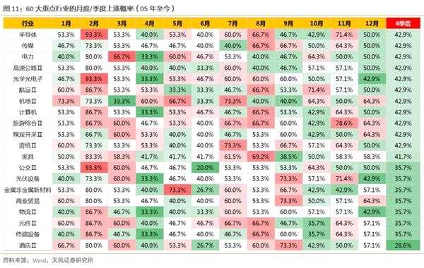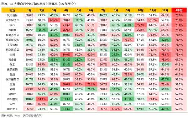 對(duì)于四季度,建議布局一些“穩(wěn)定類板塊”,年底完成估值切換的概率極高。在05年至今,我們統(tǒng)計(jì)的四季度60大重點(diǎn)行業(yè)上漲概率中,風(fēng)電、水泥、保險(xiǎn)、銀行、養(yǎng)殖、特高壓、工程機(jī)械、航運(yùn)、空調(diào)上漲的概率都超過了70%。