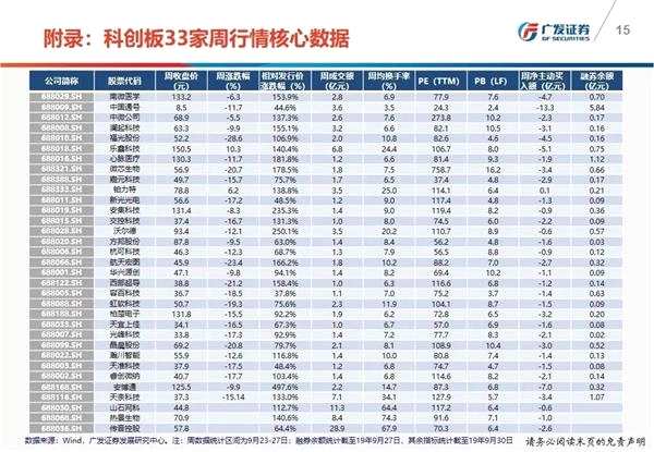一周行情總覽:1)科創(chuàng)板指(按流通市值加權(quán),個股權(quán)重上限15%)下跌2.65%至2149.21;2)日均成交額84.81億元,日均換手率12.04%;2)個股漲跌幅與近三年凈利潤、周換手率相關(guān)性較高,相關(guān)系數(shù)分別為0.52、0.56。