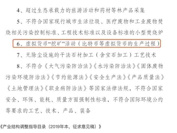 2019年4月8日,在《產(chǎn)業(yè)結(jié)構(gòu)調(diào)整指導(dǎo)目錄(2019年本,征求意見稿)》,虛擬貨幣“挖礦”活動被列入淘汰類產(chǎn)業(yè),屬于“落后生產(chǎn)工藝裝備”類目。該指導(dǎo)目錄還顯示,未標(biāo)淘汰期限或淘汰計劃的條目為國家產(chǎn)業(yè)政策已明令淘汰或立即淘汰。而虛擬貨幣“挖礦”活動這一條沒有標(biāo)上“淘汰期限或淘汰計劃”