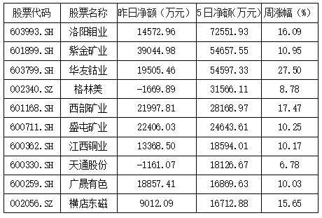 本周有色金屬概念大單凈流入前十: