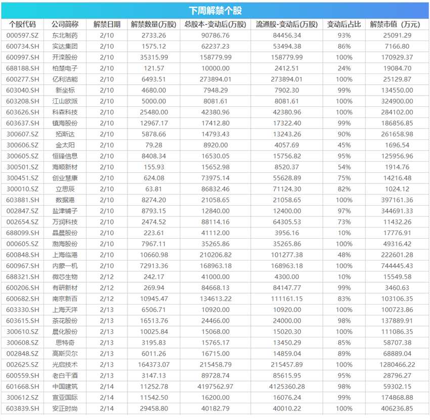柏楚電子即將有121.57萬(wàn)股限售股于2月10日上市流通,占公司總股本的1.22%,以7日收盤(pán)價(jià)計(jì)算,對(duì)應(yīng)解禁市值1.91億元;【微芯生物(688321)、股吧】在2月12日將有242.17萬(wàn)股限售股上市流通,占公司目前股份總數(shù)的比例為0.59%,解禁市值1.55億元;晶晨股份2月10日將有223.61萬(wàn)股限售股上市流通,占公司目前股份總數(shù)的比例為0.54%,解禁市值1.78億元。