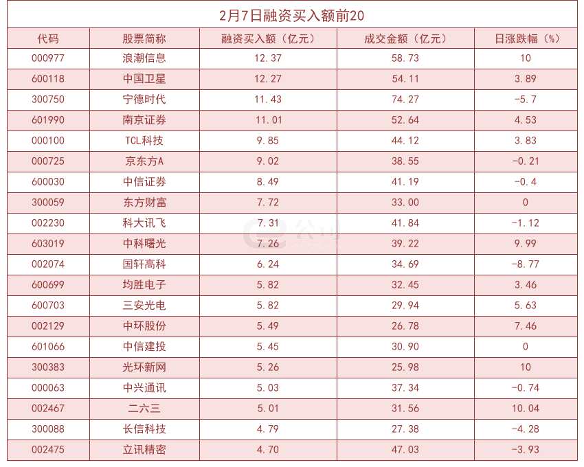 從融資資金買入金額來看,共有231只個股買入金額超億元,其中浪潮信息(12.37億元)、中國衛(wèi)星(12.27億元)、寧德時代(11.43億元)居前三位。