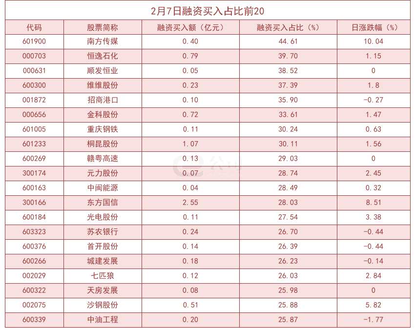 個股方面,滬深兩市共有1599只個股有融資資金買入。從融資買入額占當(dāng)日總成交金額比重來看,共有105只股票融資買入額占比超20%,其中南方傳媒(44.61%)、恒逸石化(39.70%)、順發(fā)恒業(yè)(38.52%)排名前三。