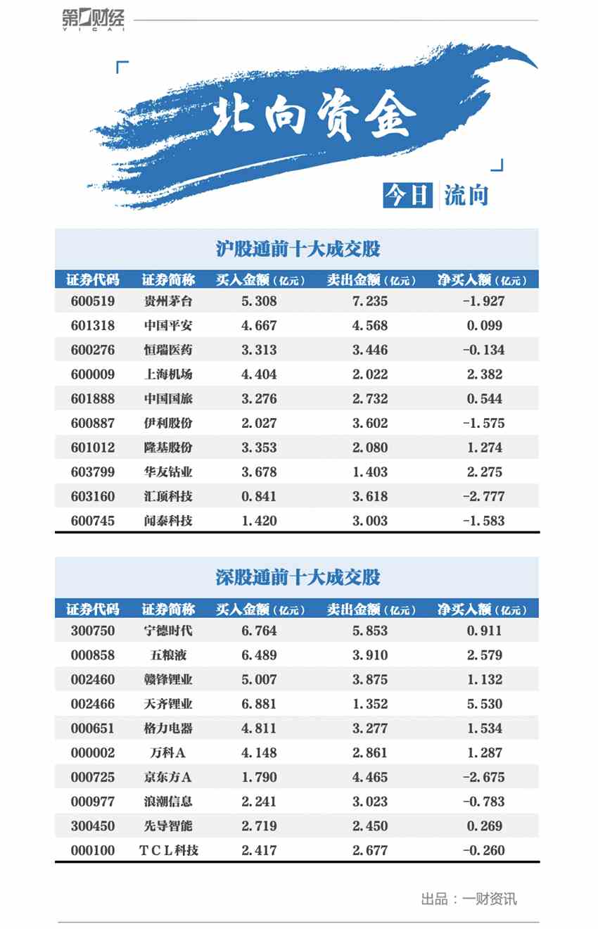 前十大成交股中,凈買入額居前三的是天齊鋰業(yè)、五糧液、上海機(jī)場(chǎng),分別獲北向資金凈買入5.53億元、2.58億元、2.38億元。