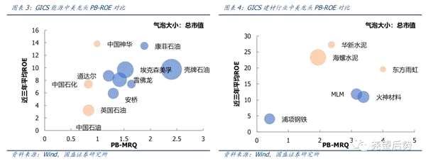從 PB-ROE 角度,對比中美周期龍頭估值水平。A 股龍頭估值相對較低,部分盈利更優(yōu),尤其是能源、建材、建筑、地產(chǎn)行業(yè)。便于中美對比,采取 GICS 行業(yè)分類。