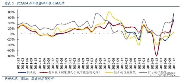 3)景氣度驅(qū)動:在基本面上,科技成長同樣具備較強支撐和景氣度優(yōu)勢。從2019年業(yè)績預(yù)告的情況來看,2019年四季度創(chuàng)業(yè)板業(yè)績將大幅反彈,相對主板業(yè)績優(yōu)勢顯著。具體來看,創(chuàng)業(yè)板剔除溫氏股份、樂視、寧德時代、【堅瑞沃能(300116)、股吧】和光線傳媒后,四季度業(yè)績增速預(yù)計為48.8%,較三季度的7.0%回升41.7個百分點;創(chuàng)業(yè)板指四季度業(yè)績增速預(yù)計為5.9%,較三季度的-8.4%回升14.4個百分點;創(chuàng)業(yè)板權(quán)重股(總市值占比前20個股)4季度業(yè)績增速預(yù)計為53.4%,較三季度的40.5%回升12.9個百分點。
