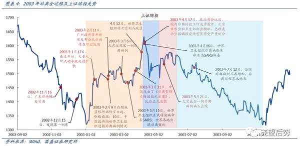疫情沖擊,短期市場大幅波動,風(fēng)險偏好是核心。與本次疫情類似,2003年非典疫情期間,在4月中旬到5月中旬的非典高峰期,同樣出現(xiàn)了投資者恐慌情緒蔓延,對于疫情的擔(dān)憂成為市場主要矛盾。除了醫(yī)藥及部分高景氣行業(yè)具備明顯抗跌性外,大部分板塊集中調(diào)整。但隨著各項應(yīng)對措施及時落地,從5月中旬開始,非典逐步得到控制并進入到疫情緩和期。此時,風(fēng)險偏好明顯修復(fù),并同樣成為引導(dǎo)行情的主線。
