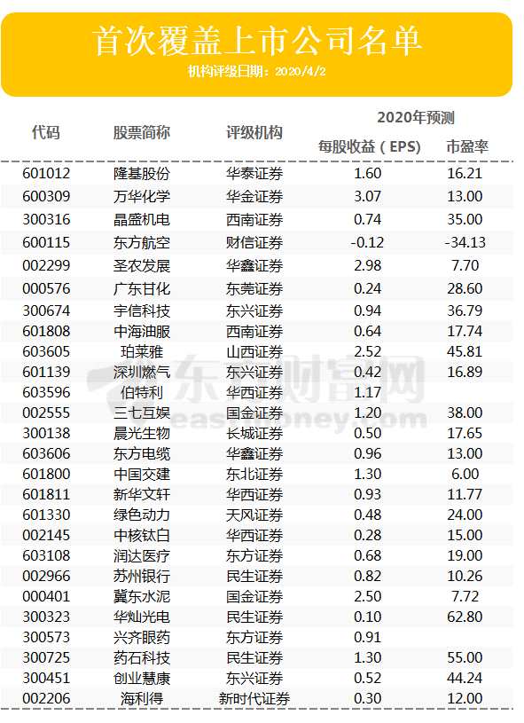 與此同時(shí),當(dāng)天還有28家公司股票評(píng)級(jí)被首次覆蓋。以下為4月2日被機(jī)構(gòu)首次覆蓋的上市公司名單: