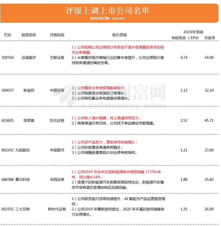 除邁瑞醫(yī)療外,當(dāng)天還有5家股票評(píng)級(jí)也被調(diào)高。以下為4月2日被機(jī)構(gòu)上調(diào)的上市公司名單:
