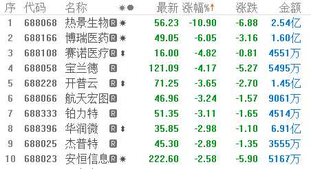 跌幅方面,醫(yī)藥板塊的回調(diào)走弱,帶動(dòng)了相關(guān)個(gè)股的下挫,熱景生物(688068.SH)跌逾10%,【博瑞醫(yī)藥(688166)、股吧】(688166.SH)、賽諾醫(yī)療(688108.SH)等跟跌。此外,寶蘭德(688058.SH)、開普云(688228.SH)、航天宏圖(688066.SH)等多股現(xiàn)不同程度下跌。