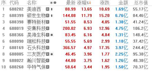 漲幅方面,在醫(yī)藥板塊表現(xiàn)低迷的時(shí)候,美迪西(688202.SH)、【昊海生科(688366)、股吧】(688366.SH)、特寶生物(688278.SH)、華熙生物(688363.SH)等多股逆市上揚(yáng),其中美迪西漲逾13%,昊海生科漲逾6%;碩世生物(688399.SH)并沒有受到體外診斷板塊下跌的影響,收漲11.79%。此外,安集科技(688019.SH)、瑞松科技(688090.SH)、石頭科技(688169.SH)等多股現(xiàn)不同程度上漲。