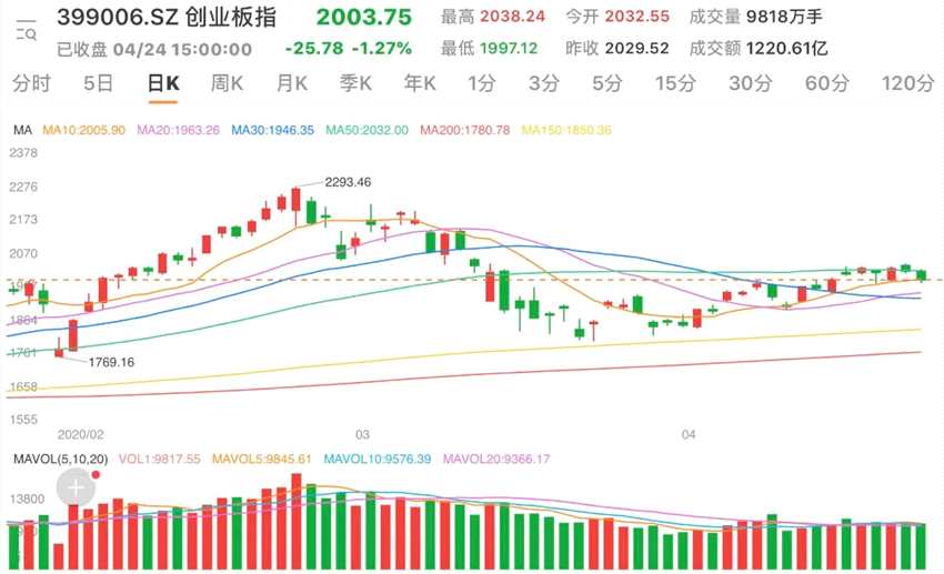 4月24日早盤,兩市開盤漲跌不一,盤初醫(yī)藥、農(nóng)業(yè)等題材回調(diào),帶動(dòng)指數(shù)下行,悉數(shù)飄綠;盤中白酒、特高壓發(fā)力,指數(shù)小幅反彈;午后再度走弱,跌幅均逾1%,創(chuàng)指短暫失守2000點(diǎn)。盤面上,個(gè)股普跌,兩市逾3000股飄綠,逾40股漲停,市場整體氛圍較弱。如何看待今天的市場情況?未來A股走勢又將如何呢?