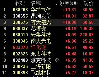 今日光刻膠板塊走強(qiáng),華特氣體漲超7%,晶瑞股份、容大感光漲停、芯源微、永太科技、南大光電、江化微、雅克科技等跟漲。