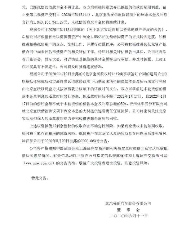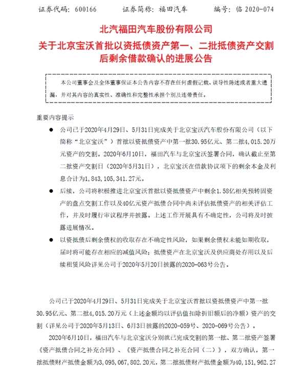 2020年6月12日,福田汽車(chē)公告,北京寶沃已于4月29日、5月31日向福田汽車(chē)交割完首批以資抵債資產(chǎn)中第一、二批資產(chǎn),且兩方于6月10日簽署合同確認(rèn)北京寶沃在借款協(xié)議項(xiàng)下的剩余本金及利息還有18.43億元。