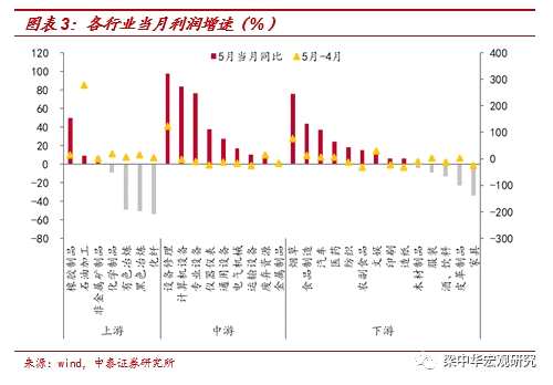 在工業(yè)方面,大多數(shù)上游工業(yè)有所改善,黑色金屬冶煉下降幅度縮小到-57.2%(上月為-60.4%),化工產(chǎn)品下降幅度縮小到-38.6%(上月為-48%),煤炭開采上升幅度擴(kuò)大到-31.2%(上月為-27%)。下游行業(yè)生活必需品保持正增長(zhǎng),汽車明顯反彈。煙草產(chǎn)品行業(yè)利潤(rùn)總額增長(zhǎng)28.1%(上月增長(zhǎng)22.6%),農(nóng)副食品加工業(yè)增長(zhǎng)19%(上月增長(zhǎng)20%),汽車增長(zhǎng)-33.5%(上月增長(zhǎng)-52.1%)。新經(jīng)濟(jì)利潤(rùn)大幅反彈,電機(jī)下降幅度收窄至-11.6%(上月為-22.9%),特種設(shè)備上升至16.6%(上月為-3.1%)。在41個(gè)行業(yè)類別中,利潤(rùn)總額同比下降的行業(yè)比上個(gè)月減少了6至30個(gè)。