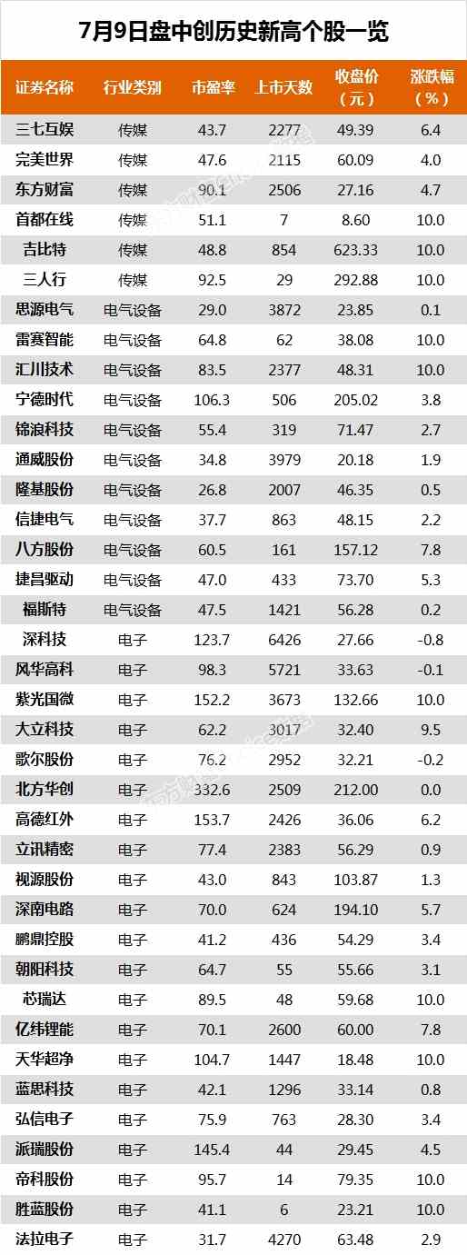 摘要: 7月9日,滬指收報3450.59點,漲1.39%。數(shù)據(jù)顯示,今日有204只個股盤中股價創(chuàng)歷史新高,個股包括完美世界、寧德時代、伊利股份、長春高新等。