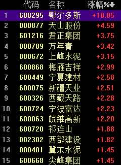 8月19日,水泥概念早盤快速拉升,截至發(fā)稿,鄂爾多斯?jié)q停,天山股份漲4%,君正集團(tuán)、萬年青、上峰水泥漲逾3%,【寧波富達(dá)(600724)、股吧】、寧夏建材等漲逾2%,冀東水泥、海螺水泥等跟漲。
