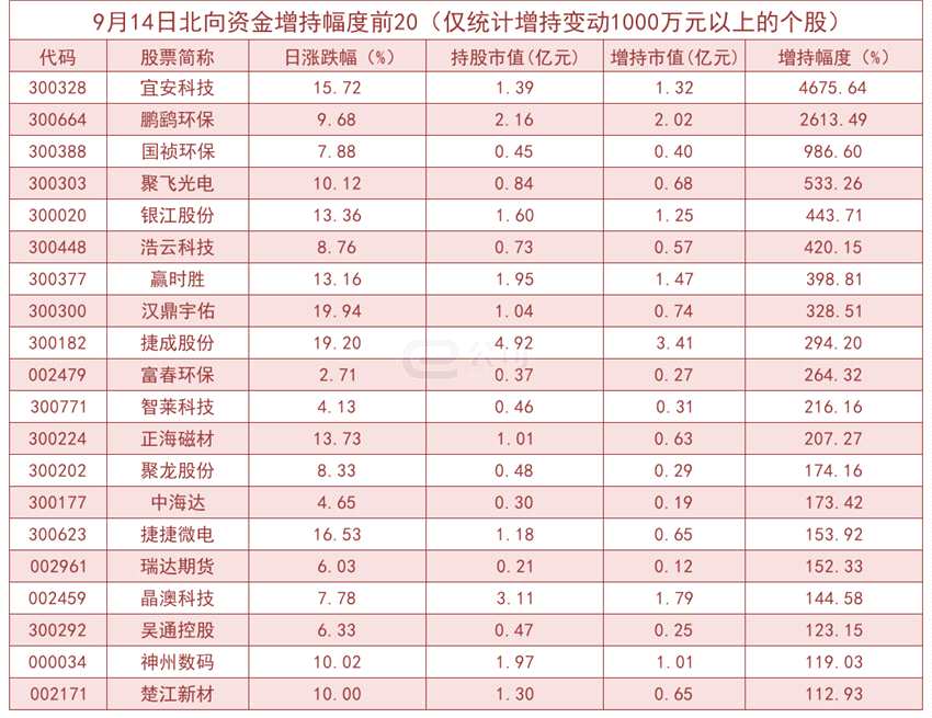 據(jù)測(cè)算,增減持變動(dòng)1000萬(wàn)元以上的個(gè)股中,宜安科技、鵬鷂環(huán)保、國(guó)禎環(huán)保、聚飛光電等獲北向資金大幅增持,分別為4675.64%、2613.49%、986.60%、533.26%。而【超聲電子(000823)、股吧】、拉卡拉、山東墨龍、盛路通信等減持幅度較大,分別減持80.54%、73.73%、57.71%、57.41%。
