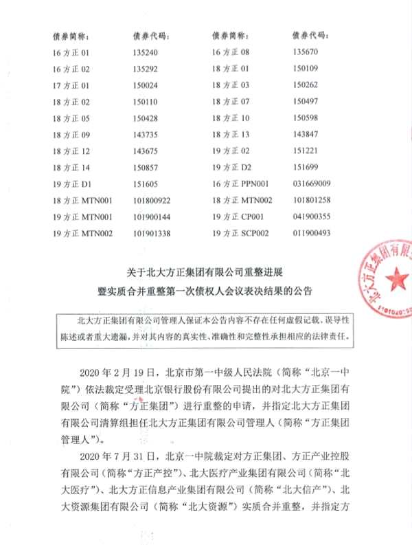2020年2月,北京第一中級(jí)人民法院依法裁定,受理北京銀行申請(qǐng)重組北大方正集團(tuán)有限公司,北大方正集團(tuán)有限公司清算組被任命為北大集團(tuán)經(jīng)理。2020年7月,北京市第一中級(jí)人民法院裁定,對(duì)方正集團(tuán)、方正財(cái)管、北大醫(yī)療、北大信產(chǎn)、北大的資源進(jìn)行實(shí)質(zhì)性合并重組。