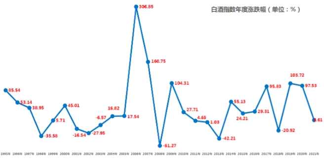 在分析白酒概念與A股申萬二級104個板塊比較后,這一部分再來看看白酒指數(shù)從1995年以來至2021年2月4日的年度漲幅幅。數(shù)據(jù)顯示,白酒在這近27個年間平均漲幅為39.60%,漲幅中位數(shù)為24.21%,漲幅最好的年份是2006年的306.85%。2007、2009和2019年三個年份漲幅超過100%,另有5個年份漲幅在50%至100%之間。