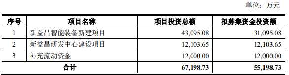 新益昌最終募集資金凈額比原計(jì)劃少1.10億元。新益昌于4月23日披露的招股說明書顯示,公司擬募集資金5.52億元,其中3.11億元用于新益昌智能裝備新建項(xiàng)目,1.21億元用于新益昌研發(fā)中心建設(shè)項(xiàng)目,1.20億元用于補(bǔ)充流動(dòng)資金。