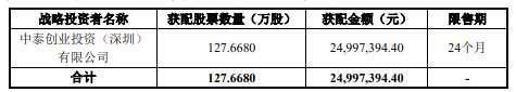本次發(fā)行的戰(zhàn)略配售由保薦機(jī)構(gòu)跟投組成,無高管核心員工專項(xiàng)資產(chǎn)管理計(jì)劃及其他戰(zhàn)略投資者安排。中泰創(chuàng)業(yè)投資(深圳)有限公司為中泰證券股份有限公司的全資子公司。中泰創(chuàng)業(yè)投資(深圳)有限公司本次獲配股數(shù)為127.67萬股,獲配金額為2499.74萬元,限售期為24個(gè)月。