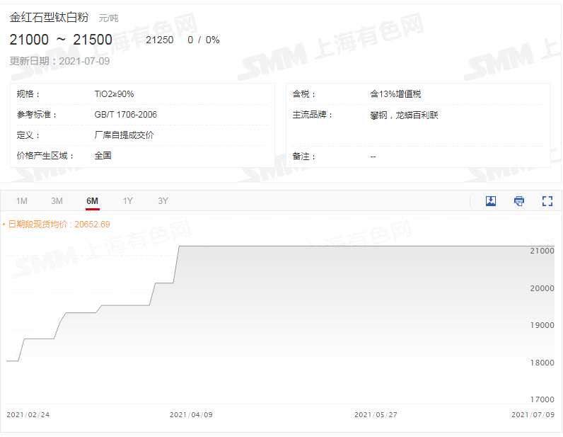 上半年以來,鈦白粉行業(yè)掀起漲價潮,各大企業(yè)均多次上調(diào)鈦白粉售價,進入下半年后,龍蟒佰利率先發(fā)布漲價通告,早在6月8日晚間,龍蟒佰利公告上調(diào)產(chǎn)品價格,自2021年7月1日起,公司各型號鈦白粉(包括硫酸法鈦白粉、氯化法鈦白粉)銷售價格在原價基礎上對下游各類客戶上調(diào)500元人民幣/噸。雖然下半年除龍蟒佰利外其他企業(yè)暫未發(fā)布漲價公告,但多個國際鈦白粉巨頭從7月1日上調(diào)鈦白粉價格也已表明出鈦白粉價格仍有上行空間。SMM認為,短期來看,考慮到目前鈦礦價格弱勢運行,市場進入傳統(tǒng)淡季,6月鈦白粉產(chǎn)量環(huán)比出現(xiàn)下滑,預計后續(xù)鈦白粉價格仍將保持弱勢調(diào)整的態(tài)勢,持續(xù)關注大廠最新價格落地情況。