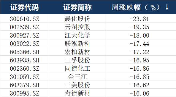 本周化工板塊中,【晨化股份(300610)、股吧】(300610.SZ)周跌幅超20%,云圖控股(002539.SZ),江天化學(xué)(300927.SZ)、聯(lián)泓新科(003022.SZ)等均大幅跟跌。