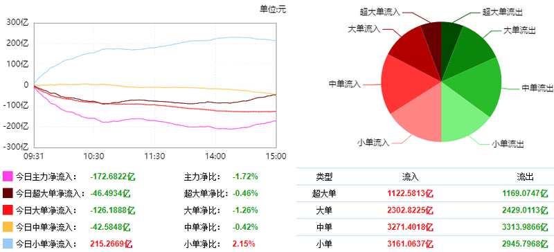 根據(jù)東財(cái)統(tǒng)計(jì),截止收盤滬深兩市呈現(xiàn)資金凈流出狀態(tài),當(dāng)日滬深兩市資金凈流出172.68億元,今日超大單凈流出46.49億元,大單凈流出126.19億元,中單凈流出42.58億元,小單凈流入215.27億元。