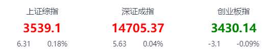 11月12日,兩市午后震蕩走高,上證綜指和深證成指漲幅較小,創(chuàng)業(yè)板指下跌。截至收盤,滬指上漲0.15%,報(bào)3539.1點(diǎn);深成指上漲0.04%,報(bào)14705.3點(diǎn);創(chuàng)業(yè)板指下跌0.09%,報(bào)3430.14點(diǎn)。