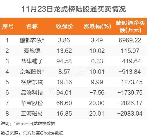 陸股通參與龍虎榜中個股共涉及8股,其中2股被陸股通凈買入,【鵬都農(nóng)牧(002505)、股吧】被買入最多,三日凈買入6969.22萬元。另外6股被陸股通凈賣出,正海磁材被賣出最多,為2983.04萬元。
