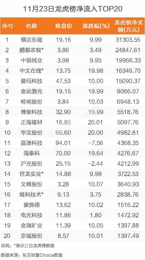 11月23日,上榜龍虎榜個股中,資金凈流入最多的是橫店東磁,為3.13億元。數(shù)據(jù)顯示,該股日內(nèi)漲停收盤,股價再創(chuàng)歷史新高。具體看,長江證券上海威海路凈買入1.62億元。