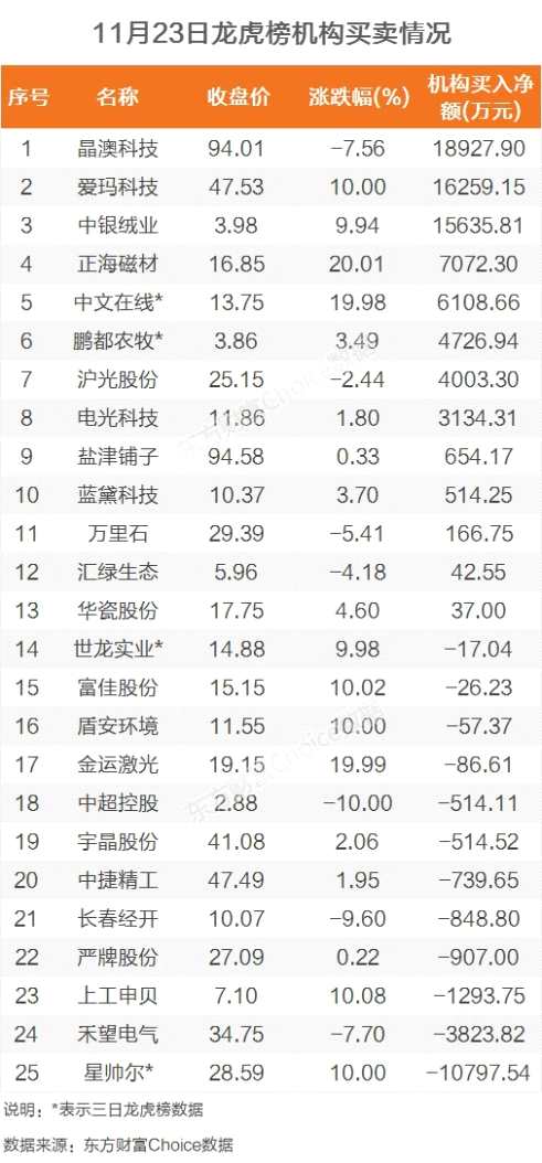 機(jī)構(gòu)參與龍虎榜中個股共涉及25股,其中13股被機(jī)構(gòu)凈買入,晶澳科技被機(jī)構(gòu)買入最多,為1.89億元。另外12股被機(jī)構(gòu)凈賣出,【星帥爾(002860)、股吧】被賣出最多,三日凈賣出1.08億元。