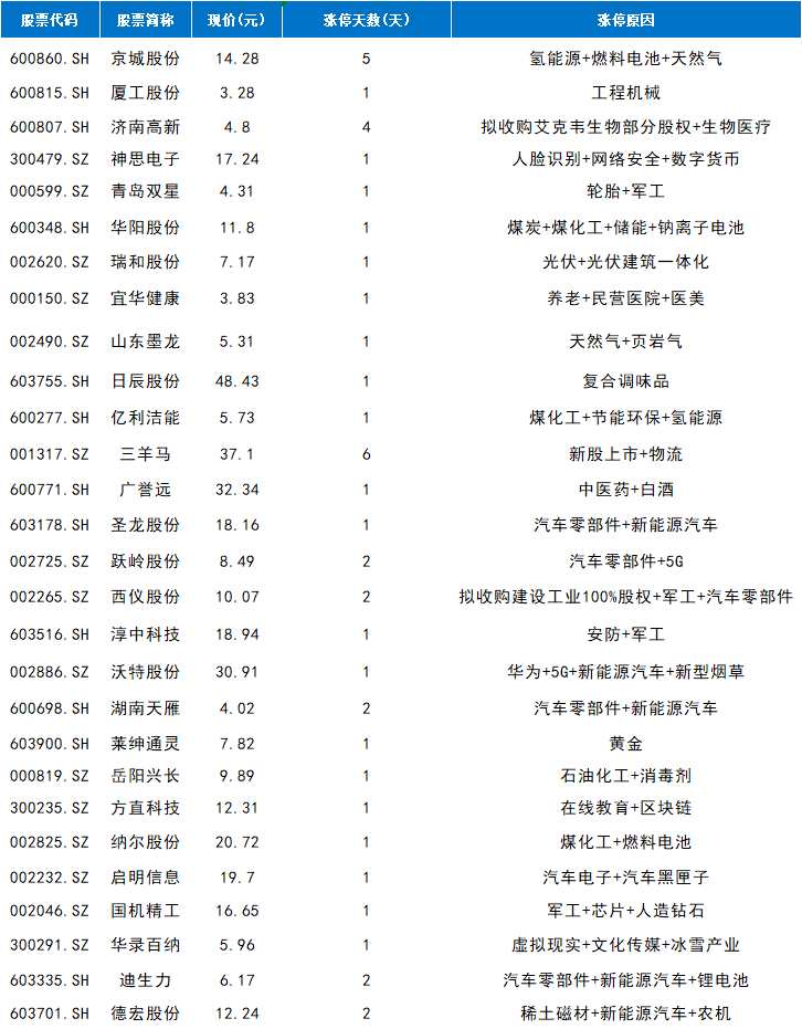 按行業(yè)來看,其他漲停個股零星分布于氫能源、汽車零部件、白酒、煤化工等板塊。